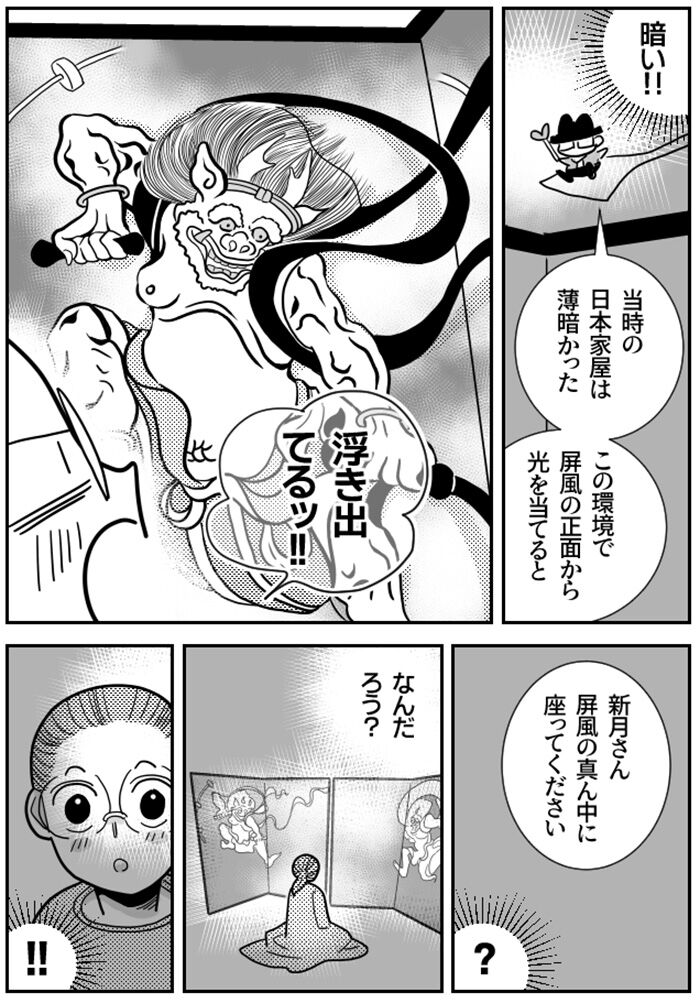 今回、風神雷神のレプリカを復元し、当時と同じ環境で鑑賞しました。当時と同じ環境とは、日本家屋です。江戸時代の日本家屋には、今のように電気はありません。